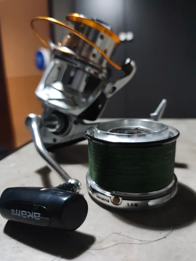 Carrete de pesca Akami CYGNUS UL con bobina de hilo verde. - Mango negro con logo Akami. - Bobina con hilo de color verde.