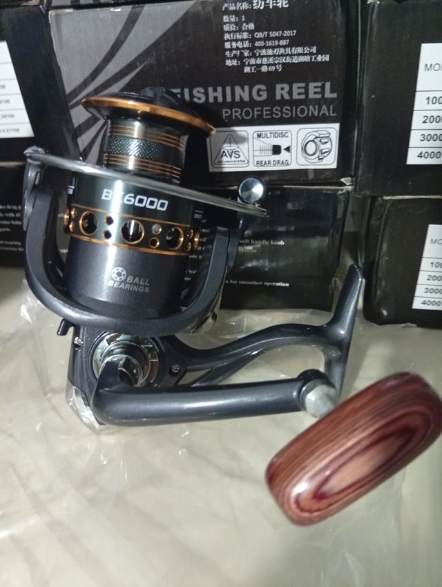 Es un carrete de apariencia robusta y elegante, ideal para la pesca.