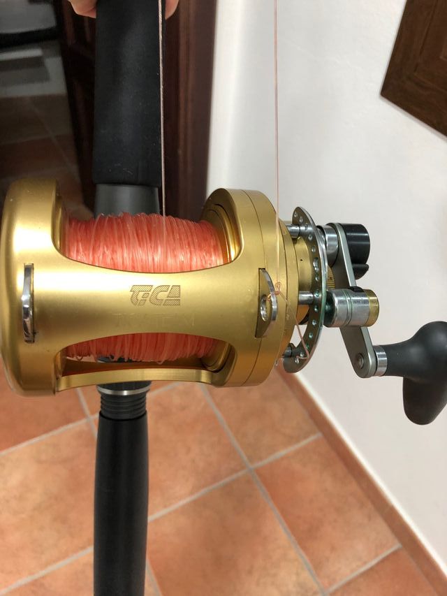 Carrete de pesca Tica Team en color dorado, con sedal naranja. - Cuerpo metálico. - Mango giratorio.