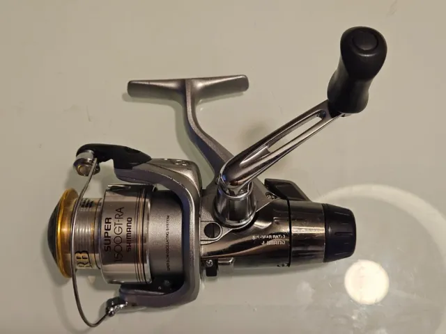 Carrete de pesca Shimano Súper GT 1500 RA. - Diseño Dyna-Balance. - Cuerpo plateado con detalles iridiscentes. - Manivela plegable.