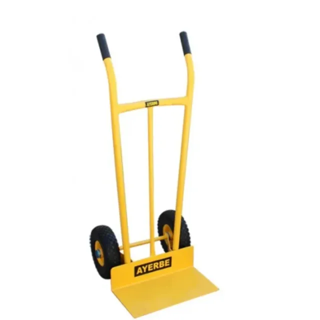 Carretilla de carga de color amarillo. - Estructura metálica. - Dos ruedas para facilitar el transporte. - Plataforma inferior para carga.