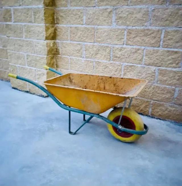 Carretilla de obra con cubeta amarilla y estructura metálica.