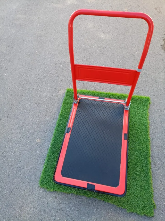 Detalles del productoCarretilla de mano plegable en color rojo, ideal para transportar cargas.