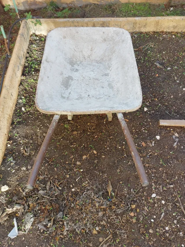 Carretilla de obra con cubeta de cemento. - Estructura metálica. - Dos patas de apoyo.
