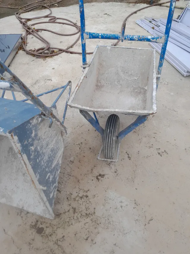 Carretilla de obra con estructura metálica azul y cubeta de cemento. - Ideal para transporte de materiales de construcción. - Rueda de goma. - Mango ergonómico.