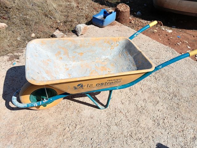 Detalles del productoCarretilla de obra de color amarillo, con capacidad de 85 litros y rueda antipinchazos. Está en buen estado, aunque muestra señales de uso.