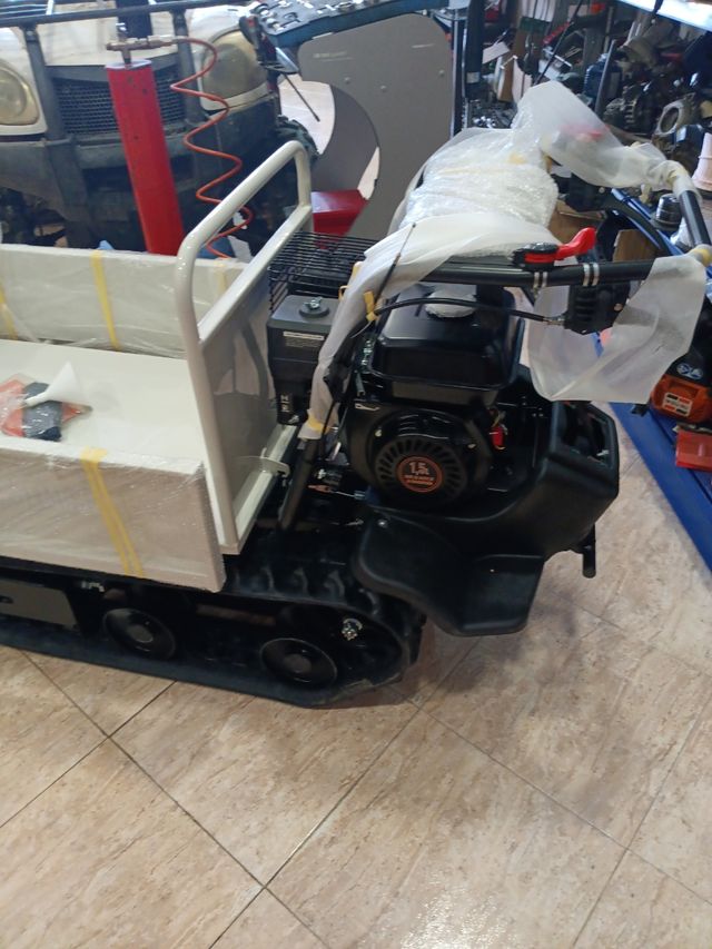 Detalles del productoCarretilla de oruga con motor, ideal para transportar materiales en terrenos difíciles. Su diseño compacto facilita su manejo.
