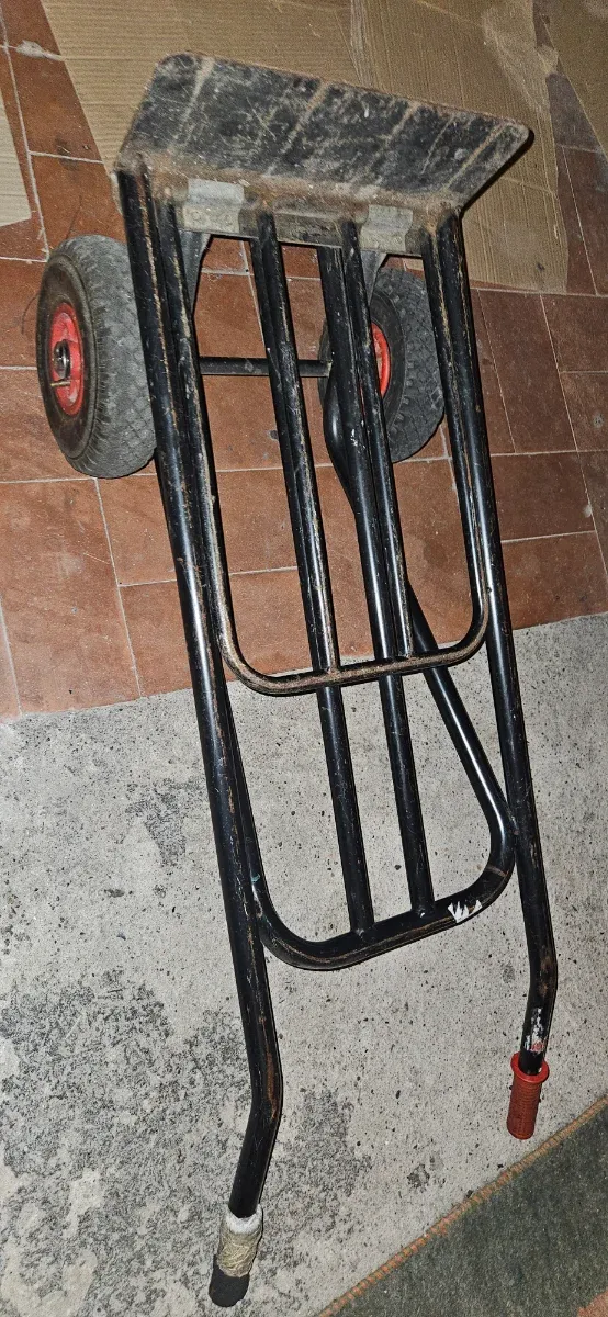 Carretilla plegable de color negro, ideal para transportar objetos. - Estructura metálica. - Ruedas para facilitar el movimiento. - Empuñaduras para un agarre cómodo.
