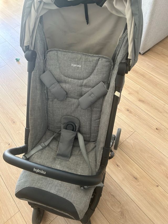Detalles del productoCarrito de bebé de la marca Inglesina en color gris. Es plegable y fácil de transportar.