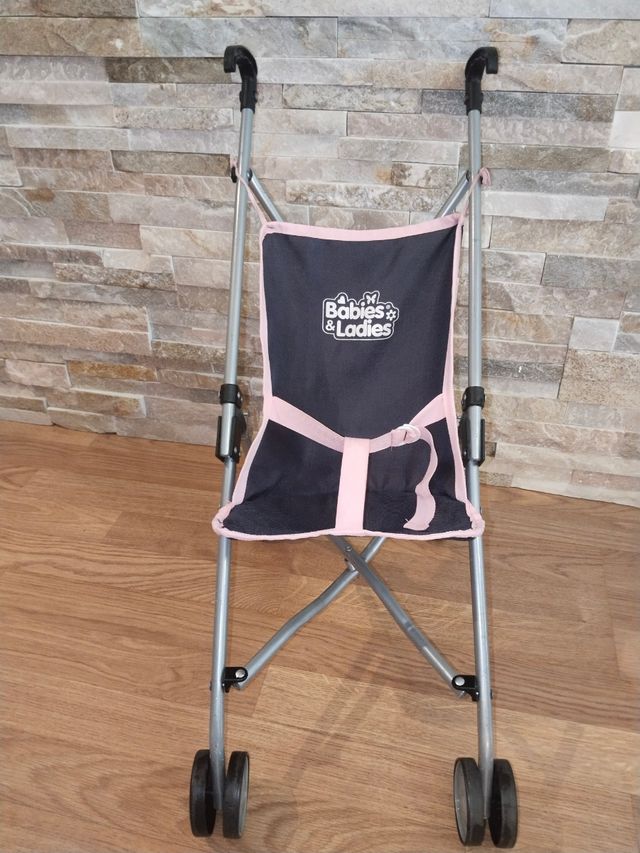 Detalles del productoPreciosa silla de paseo para muñecas, ideal para niñas. Es plegable y de color azul marino con detalles rosas.