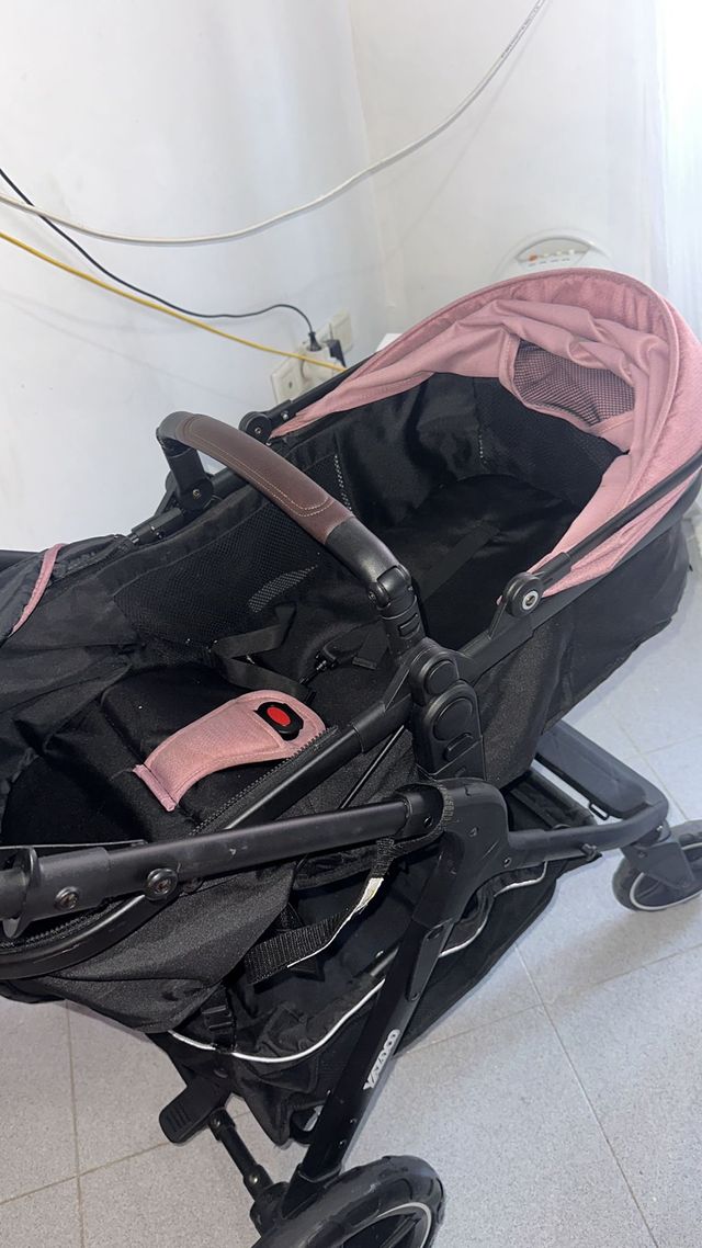 Carrito de bebé de la marca Yazoco, color negro con detalles en rosa. - Capota ajustable. - Asiento acolchado. - Arnés de seguridad. - Ruedas todoterreno.
