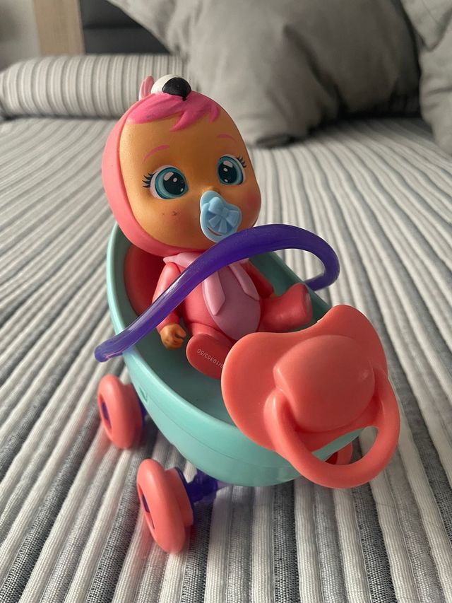 Carrito para muñecos Bebés Llorones. - Color azul y rosa. - Incluye capazo y ruedas. - Asa morada. - Tambien viene con biberon y soporte