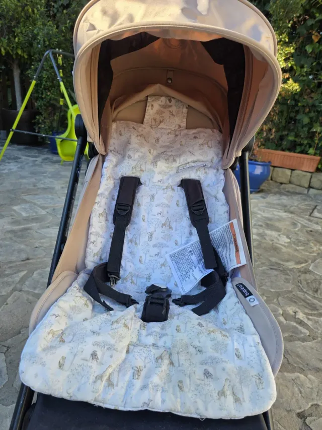 Carrito Bugaboo Butterfly en color beige con una colcha con divertido estampado.