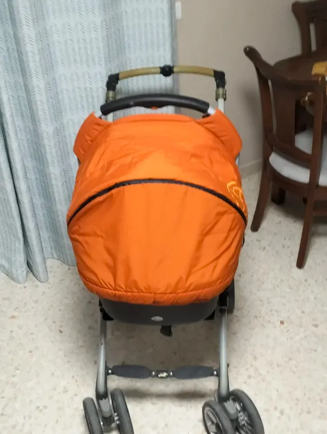 Carrito de bebé de tres piezas en color naranja. - Estructura metálica. - Capota. - Ruedas. - Asiento. - Cesta inferior.