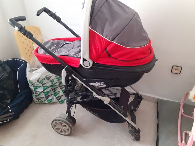 Detalles del productoCarrito de bebé de la marca Chicco, con un diseño moderno en color rojo y gris. En buen estado aunque usado. Lleva el capazo con colchón y antireflujo, la sillita y la silla del coche