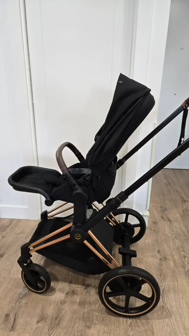 Detalles del productoCarrito de bebé Cybex Priam en color negro con detalles en rose gold. Es un cochecito elegante y funcional.