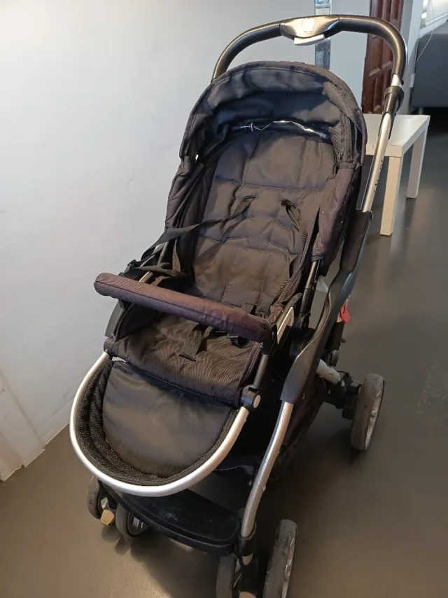Carrito de bebé en color negro, ideal para paseos. - Estructura metálica. - Asiento acolchado. - Capota. - Arnés de seguridad.