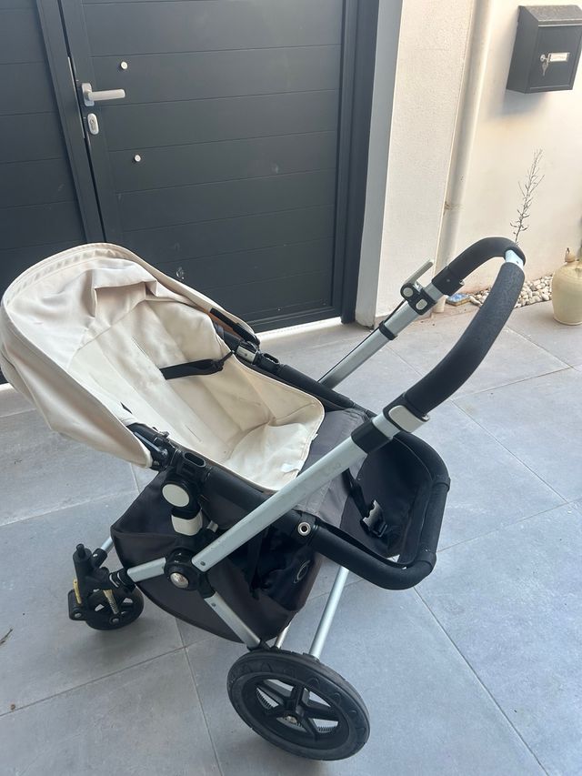 Detalles del productoCarrito de bebé con estructura metálica y asiento acolchado.