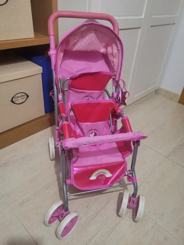 Carrito de muñecas en color rosa, con detalles de unicornios. - Capota ajustable. - Asiento acolchado. - Ruedas delanteras giratorias.