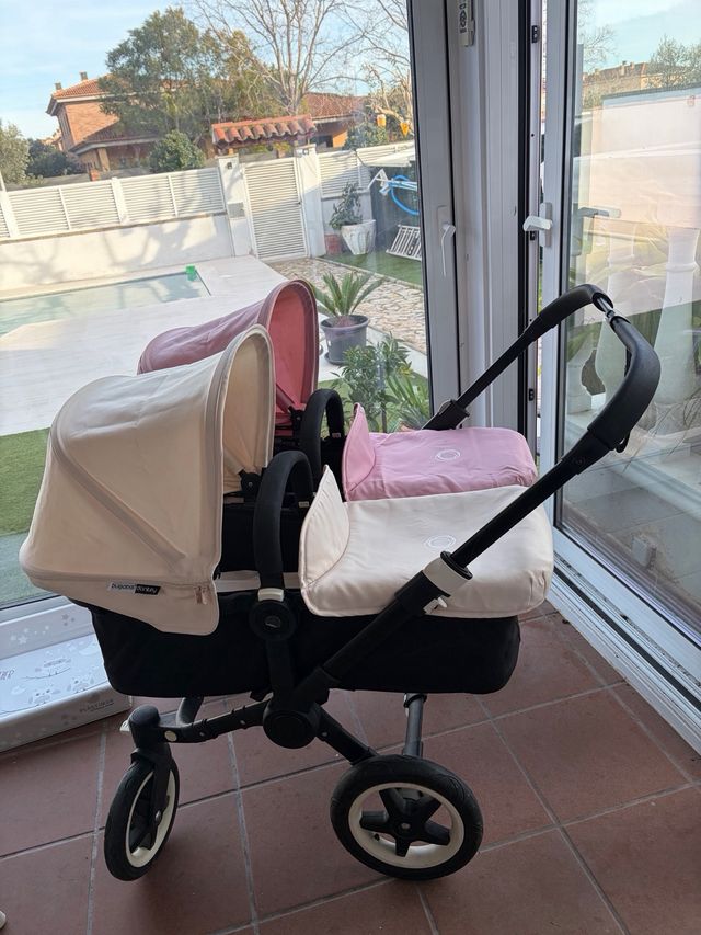 Detalles del productoCarrito gemelar Bugaboo en color beige y rosa. Perfecto para hermanos con poca diferencia de edad.