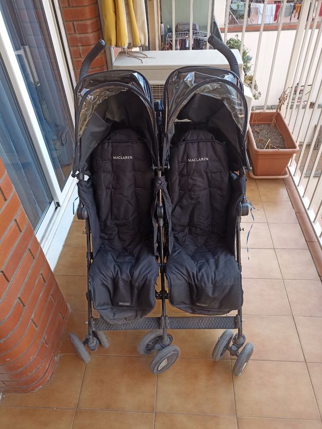 Detalles del productoCarrito gemelar de la marca Maclaren en color negro. Ideal para llevar a dos niños cómodamente.