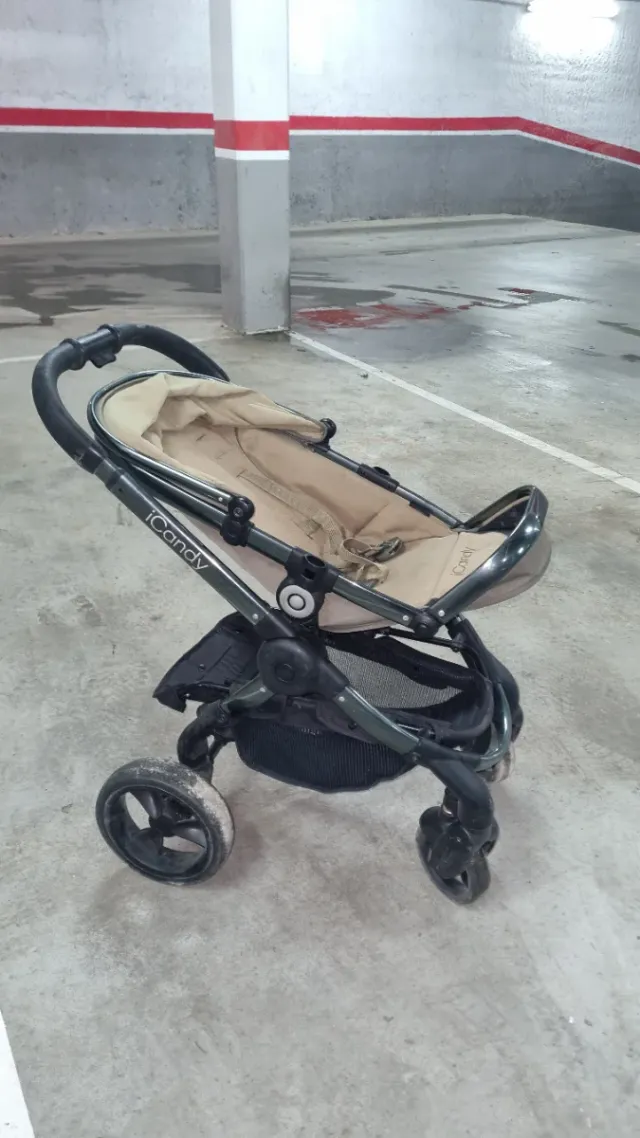 Carrito de bebé de la marca iCandy, ideal para paseos. - Asiento reclinable. - Cesta de almacenamiento inferior. - Ruedas todoterreno.