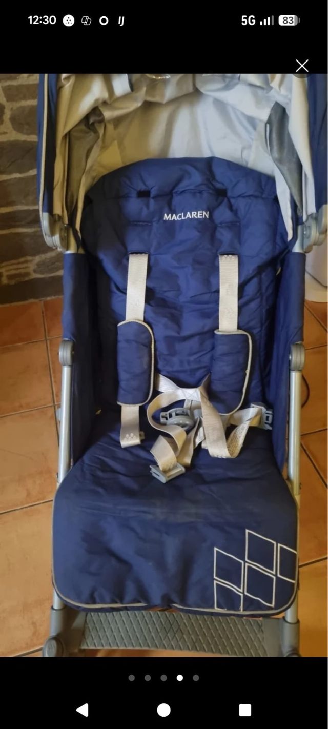 Carrito de paseo de la marca Maclaren en color azul. - Asiento acolchado. - Arnés de seguridad de 5 puntos. - Capota. - Diseño plegable.