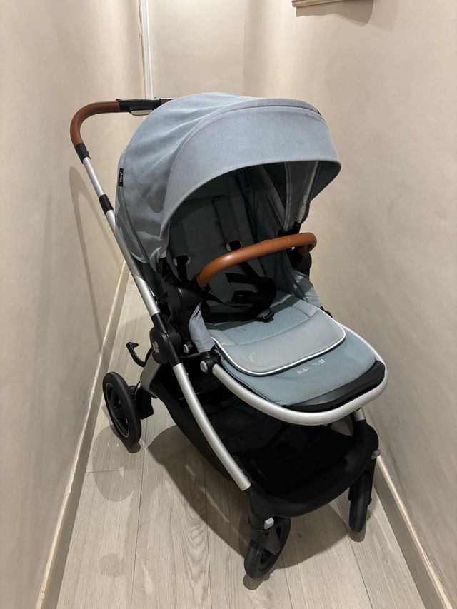 Detalles del productoCarrito de bebé Maxi Cosi Adorra 2 en color gris azulado y detalles en piel marrón.