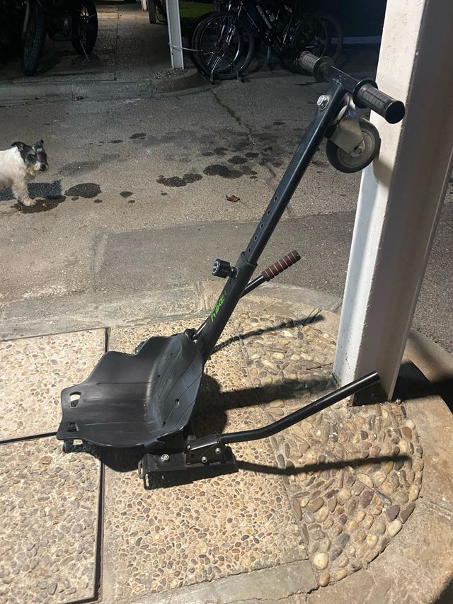Carrito para convertir tu hoverboard en un kart. Se encuentra en perfecto estado. - Estructura metálica. - Asiento ergonómico. - Ruedas delanteras giratorias.