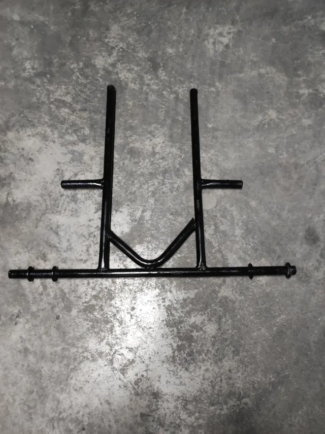 Carrito de metal negro para transportar kayaks. - Estructura robusta. - Ruedas para facilitar el transporte. - Diseño en forma de U en la base.