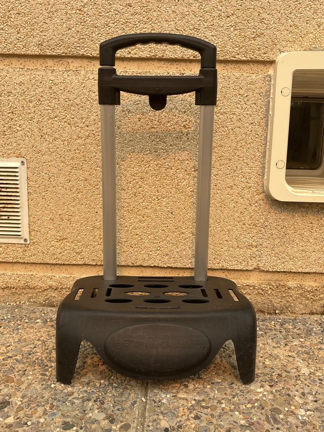 Detalles del productoSe vende carrito porta-mochilas trolley, ideal para transportar mochilas cómodamente. Es de color negro y gris, con un asa de agarre superior.
