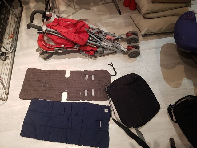 Detalles del productoVendo carro de bebé Maclaren, ligero y fácil de plegar. Incluye dos sacos para silla de paseo, uno gris y otro azul marino. También se incluye un bolso cambiador negro y enganches para los manillares. El carro está en buen estado, aunque presenta algunas señales de uso.