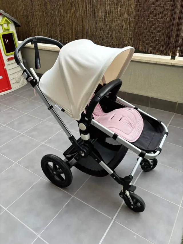 Carro de bebé Bugaboo Camaleón 3 en color blanco y negro. - Chasis plateado. - Capazo con capota extensible. - Asiento acolchado en rosa. - Ruedas todoterreno.