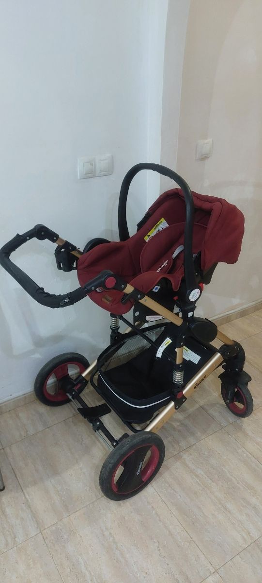 Carro cochecito para bebé en color burdeos y detalles dorados. Incluye capazo y silla. - Estructura metálica. - Ruedas todoterreno. - Cesta de almacenaje inferior.