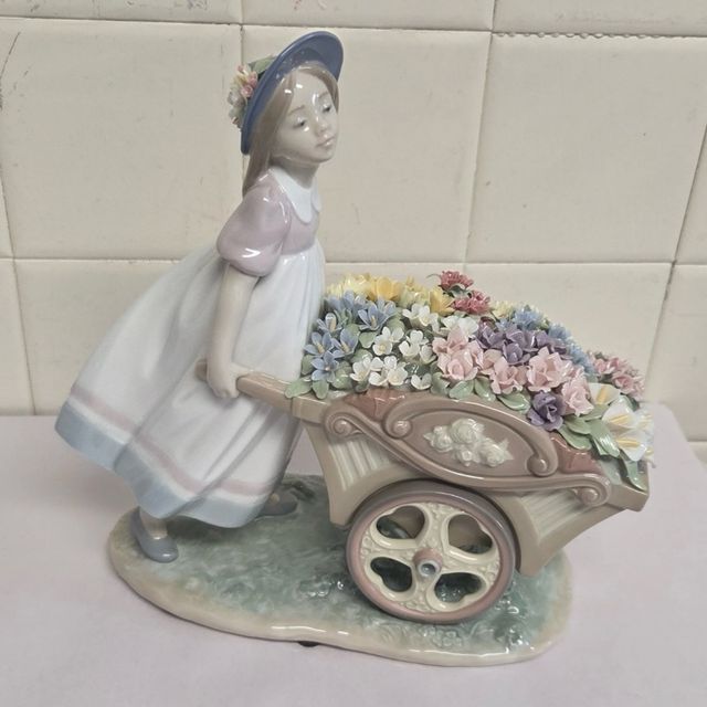 Detalles del productoFigura de porcelana Lladró que representa a una niña empujando un carro lleno de flores.
