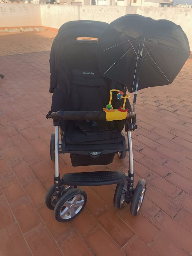 Detalles del productoCarro de bebé de la marca Casualplay en color negro y rojo. Incluye parasol, saco de inviernoy plástico protectorde lluvia.