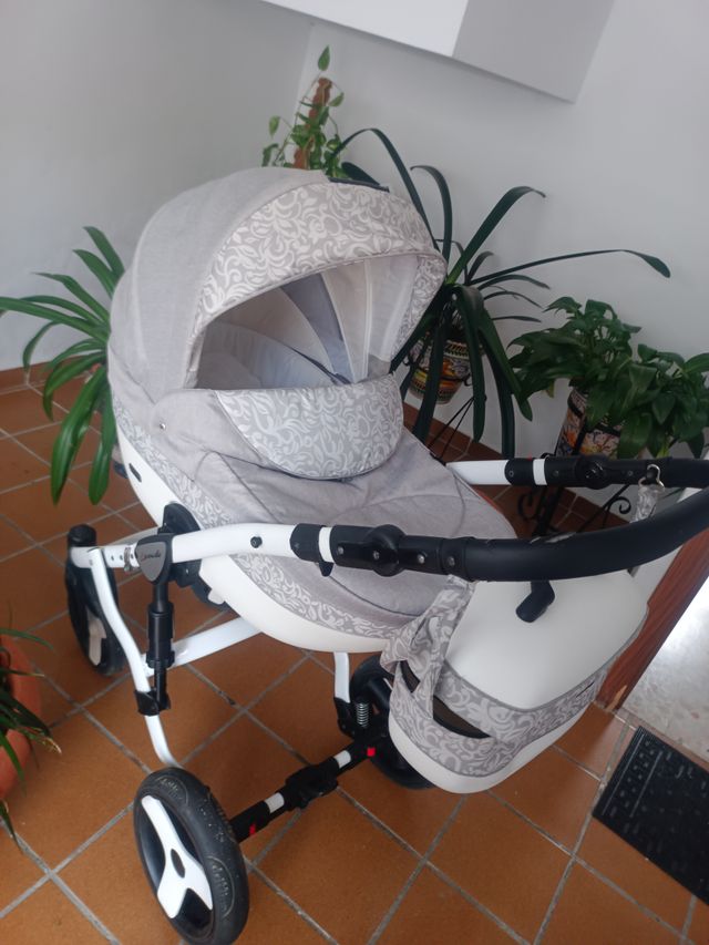 Carro de bebé completo en tonos gris y blanco, con muy poco uso.