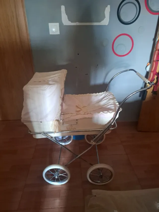 Carro de bebé de estilo clásico, ideal para muñecas reborn. - Diseño vintage. - Capota y colcha a juego. - Ruedas blancas con detalles cromados.
