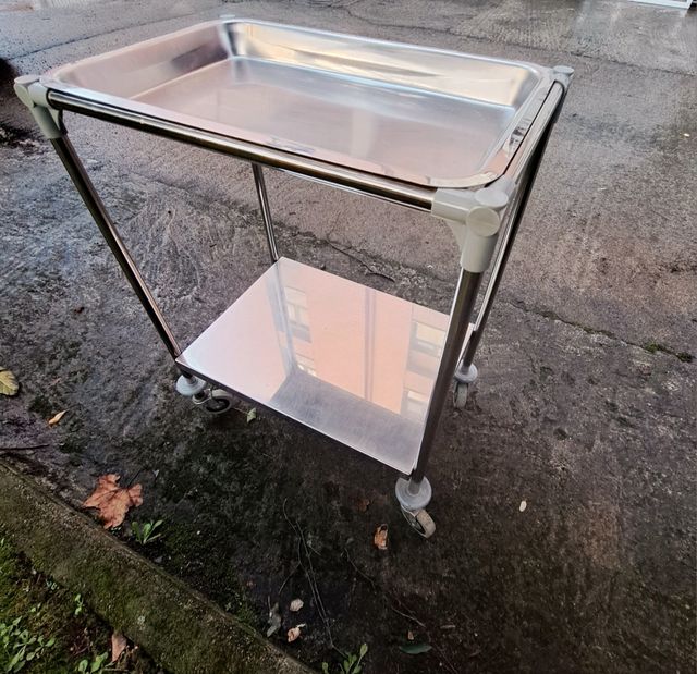 Carro de acero inoxidable con ruedas giratorias en muy buen estado para uso clínico u otras utilidades .Dispone de una bandeja superior extraíble y una inferior fija.