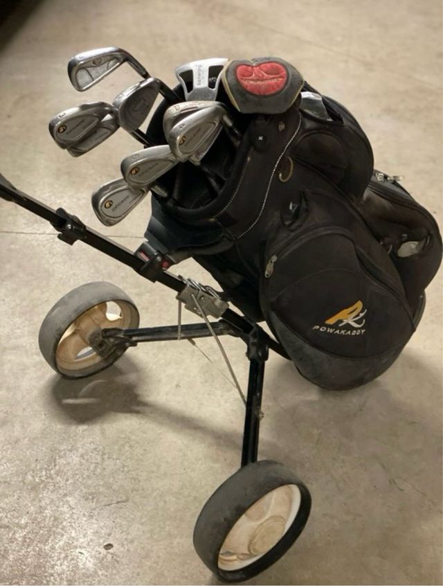 Se vende carro de golf con bolsa y palos. - Bolsa de golf marca Powakaddy. - Incluye varios palos de golf. - Carro de dos ruedas.