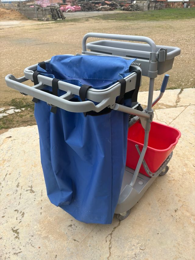 Carro de limpieza con escurridor de fregona y dos cubos de agua. En buen estado. Disponibles 3 unidades. Precio negociable si compras las 3.