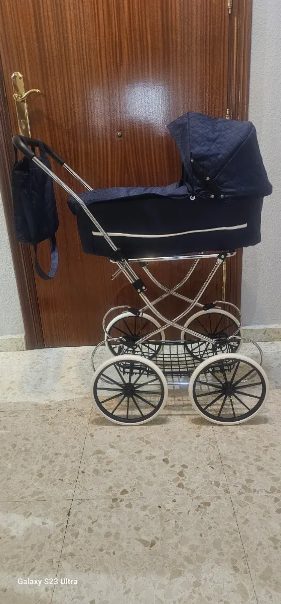 Carro de capota para muñecas, estilo clásico inglés. - Estructura cromada. - Ruedas grandes con detalles negros y blancos. - Incluye bolso a juego.