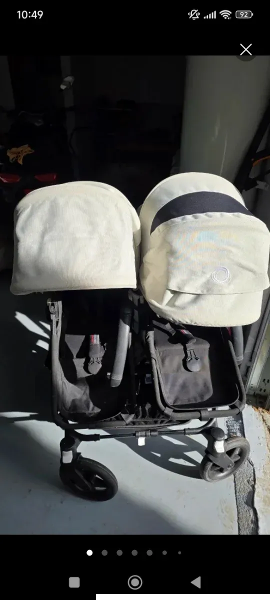 Carro gemelar Bugaboo Donkey 5 en color beige y negro,sin apenas uso. - Dos capotas extensibles. - Chasis negro. - Ruedas todoterreno. - Manillar ajustable.