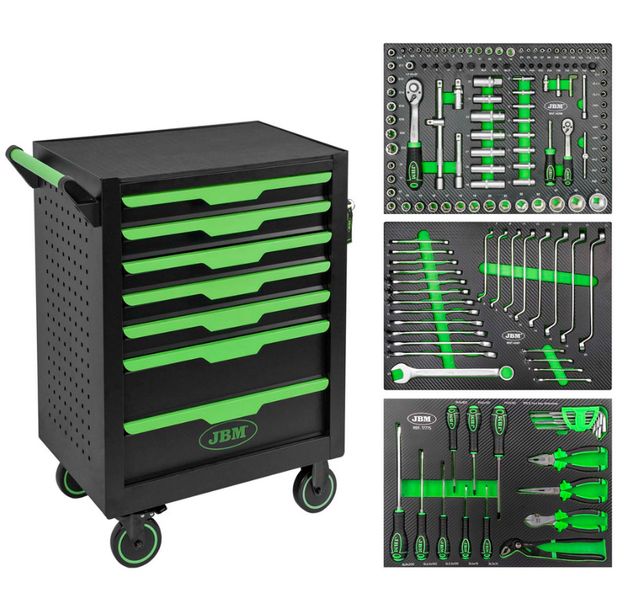 - Carro de herramientas negro con detalles en verde.