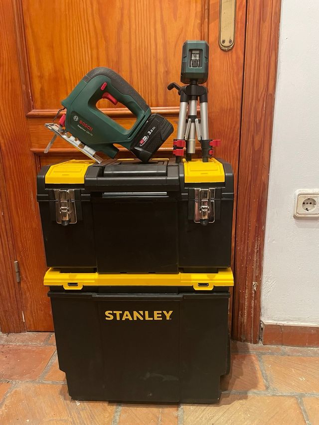 Detalles del productoConjunto de herramientas que incluye un carro de almacenamiento, una caladora y un nivel láser.