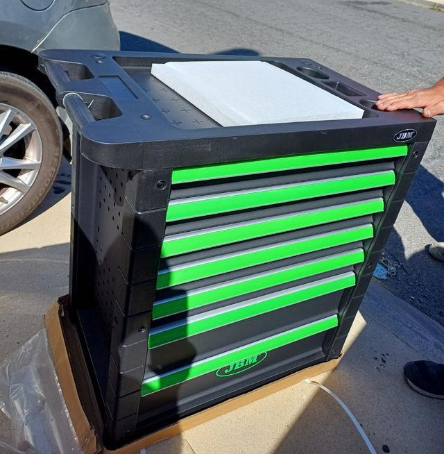 Detalles del productoCarro de herramientas JBM con 7 cajones, de los cuales 4 están llenos.