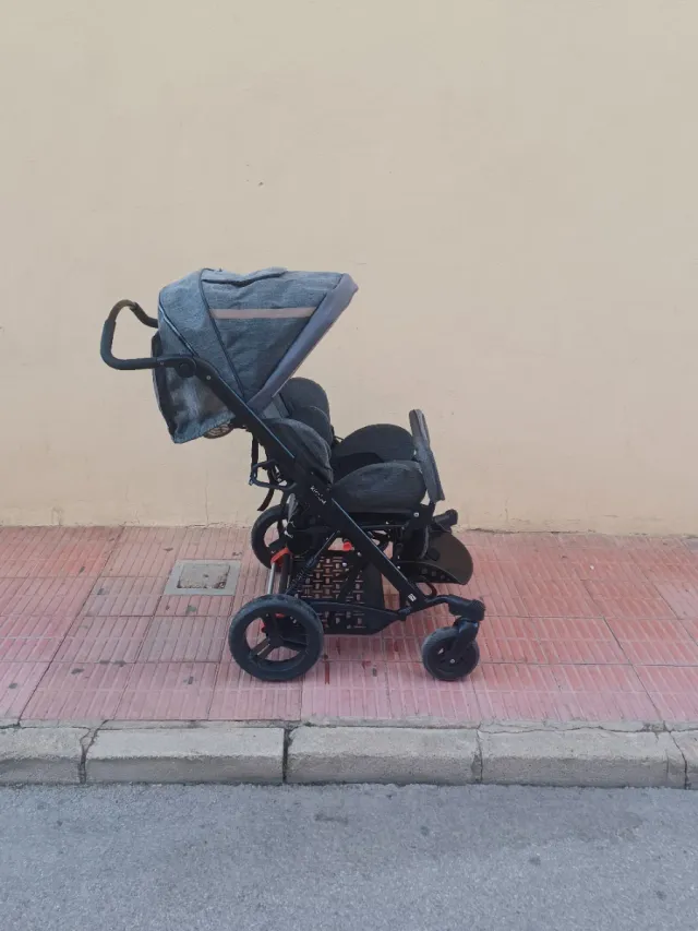 Detalles del productoCarro ortopédico diseñado para niños. Su estructura es de color gris y negro, con un diseño moderno y funcional.