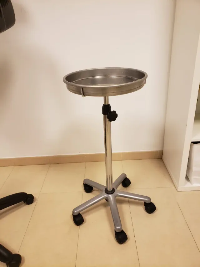 Carro auxiliar para peluquería con ruedas y bandeja. - Bandeja redonda de metal. - Altura regulable. - Base de 5 ruedas para mayor estabilidad.
