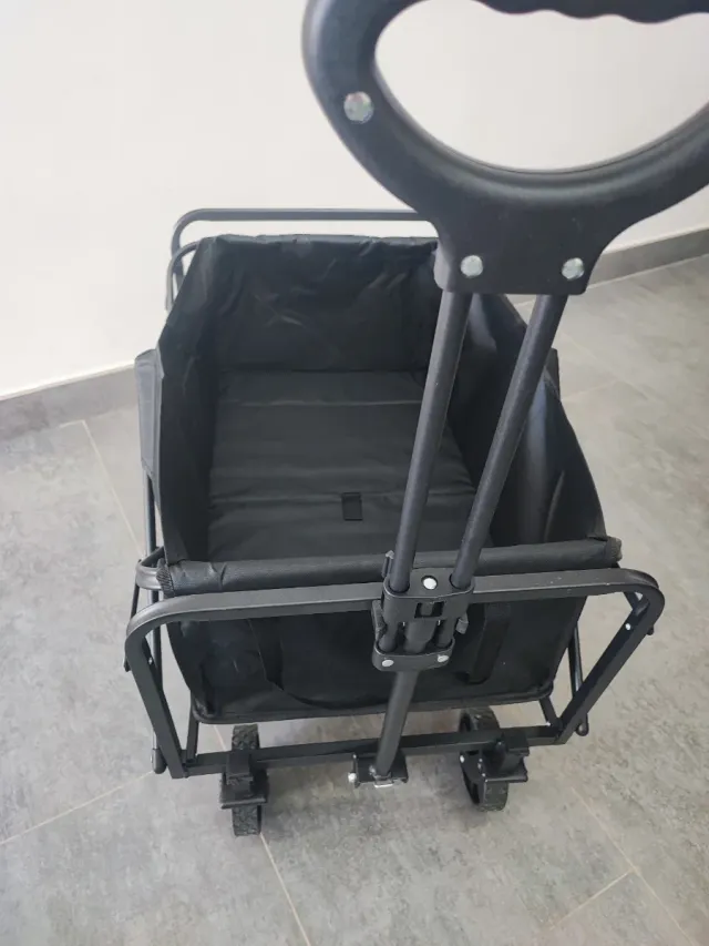 Detalles del productoCarro plegable de color negro, ideal para llevar tus cosas a la playa o de camping. Su diseño permite un fácil transporte y almacenamiento.