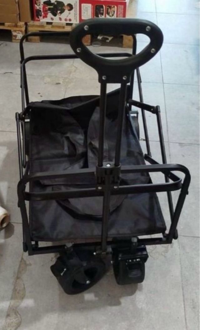 Detalles del productoCarro plegable de color negro, ideal para transportar objetos a la playa o para actividades al aire libre. Su diseño permite un fácil almacenamiento.